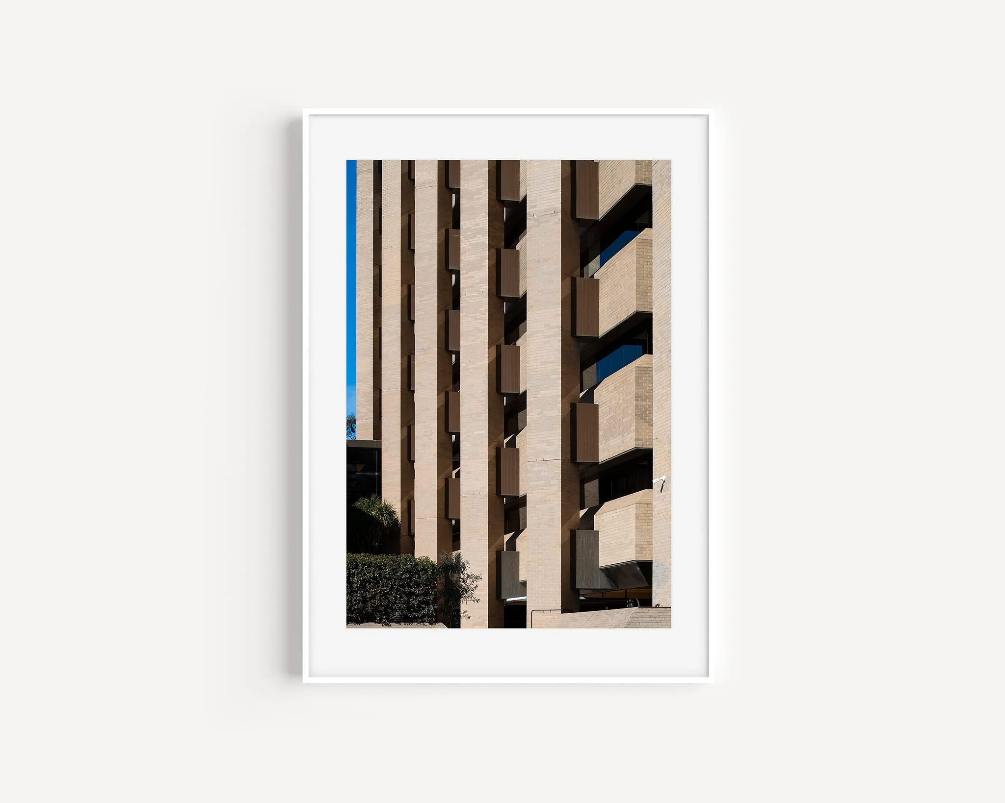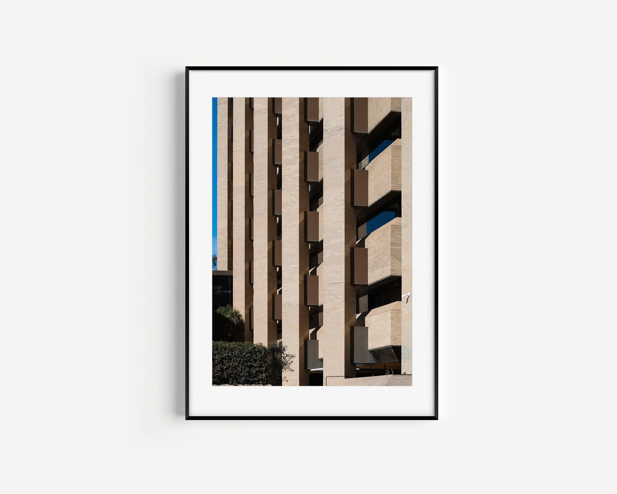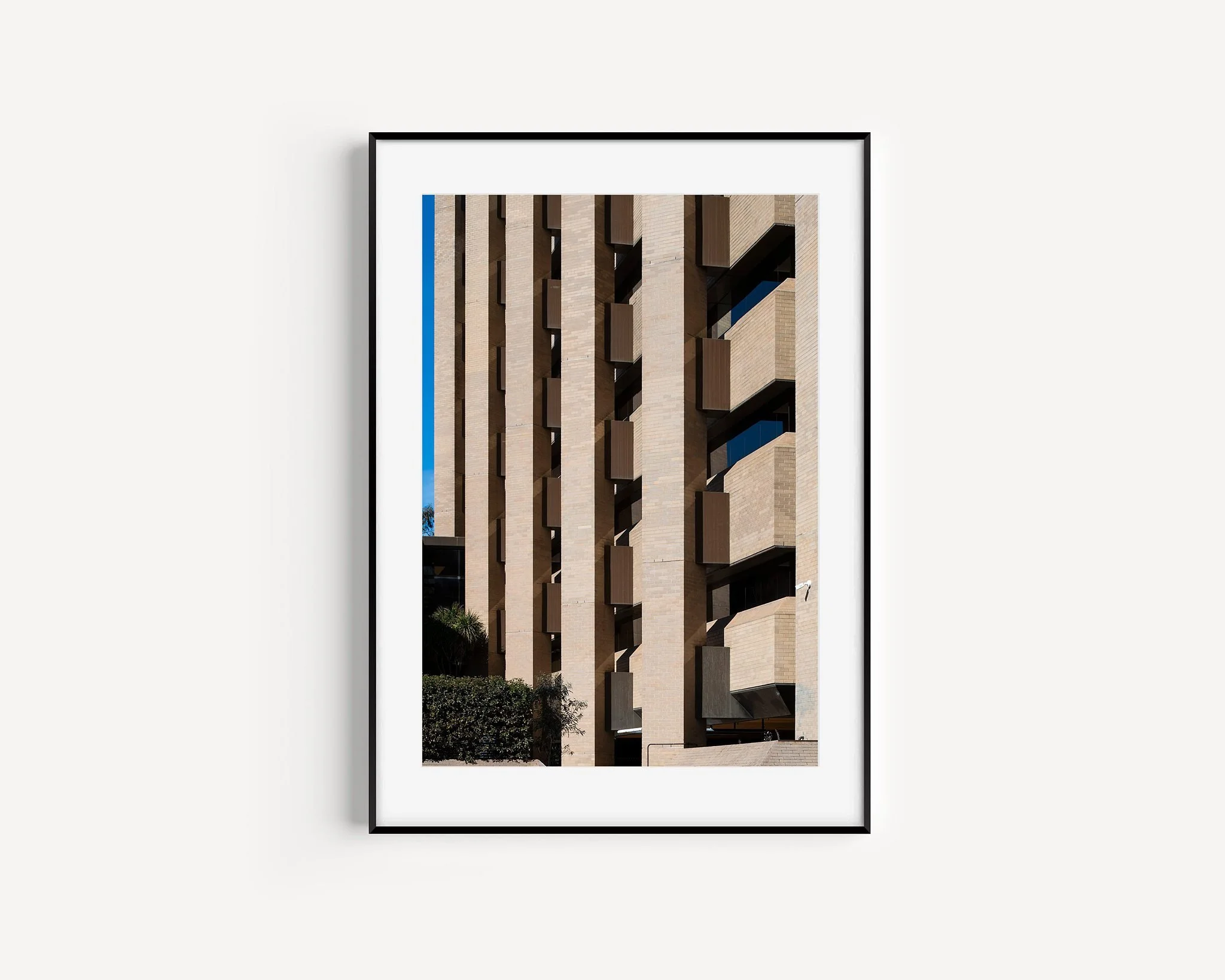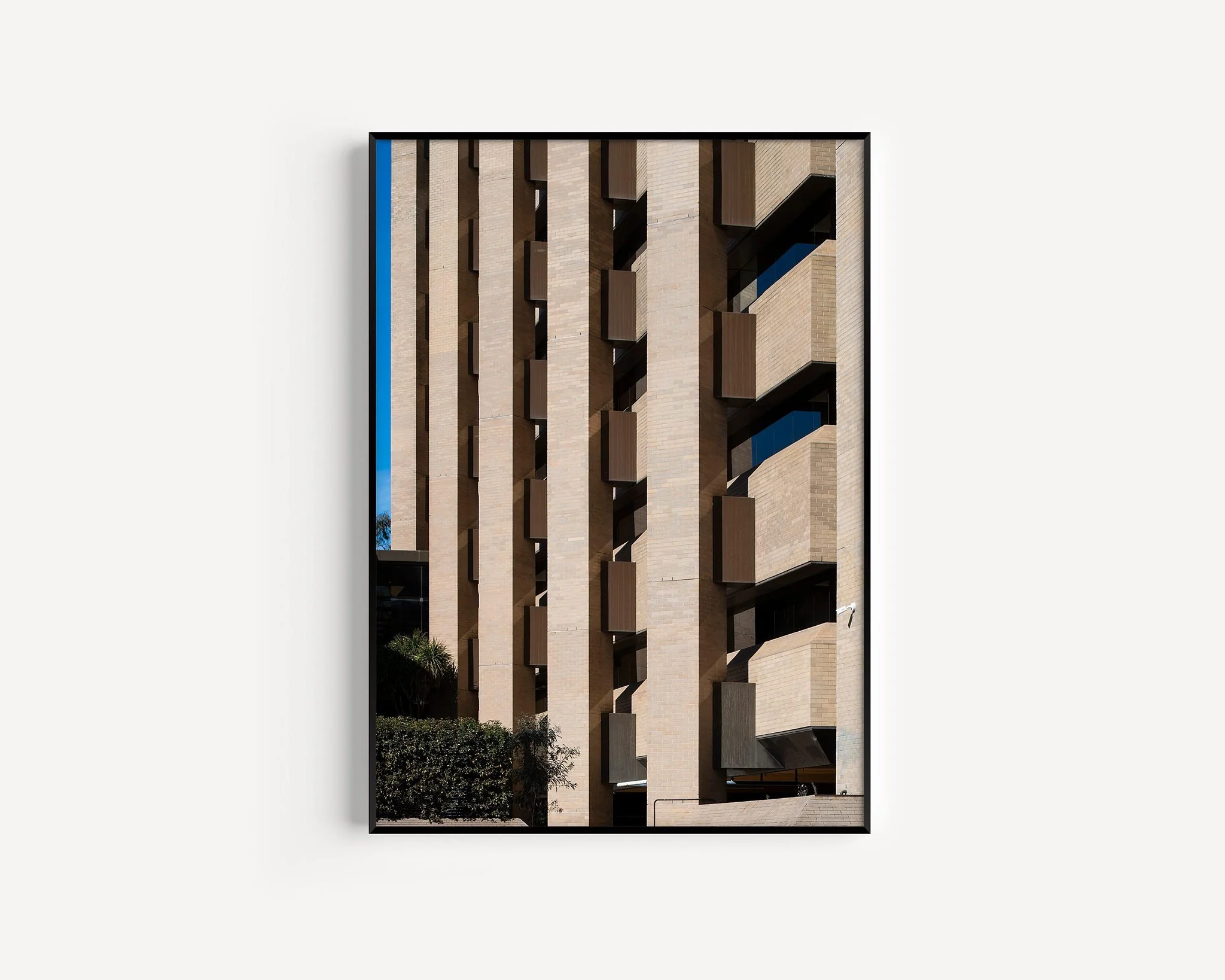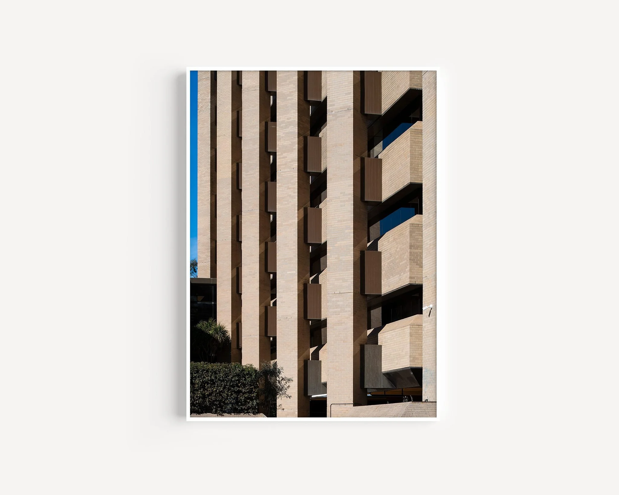The Ray Walsh House in Tamworth is a prominent example of Brutalist architecture, defined by its monumental scale and extensive use of raw, off-form concrete. Its design features strong, block-like geometric forms and deeply recessed windows, creating a powerful and fortress-like civic presence.